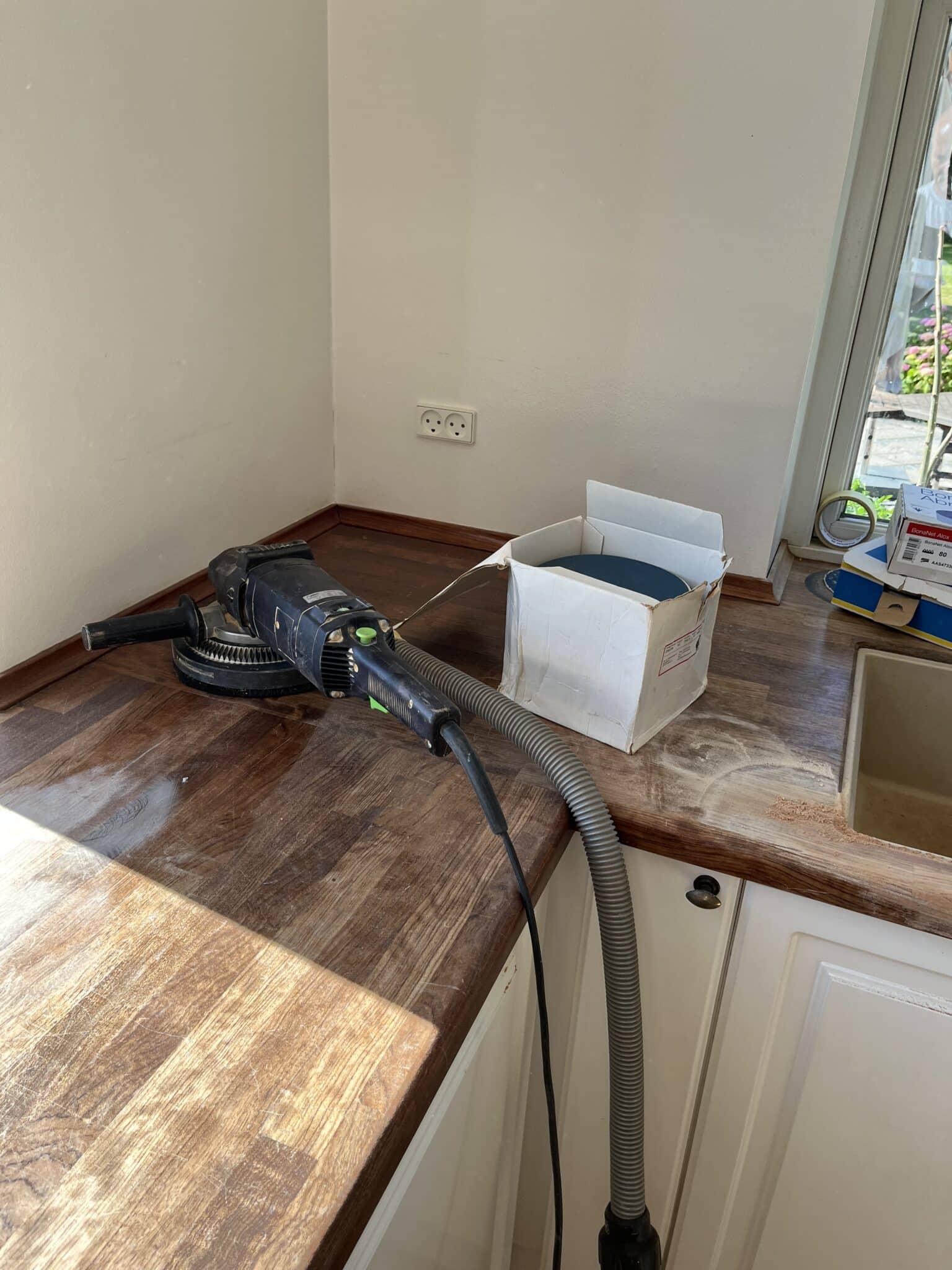 Slibning af bordplade der bringer overfladen tilbage til livet